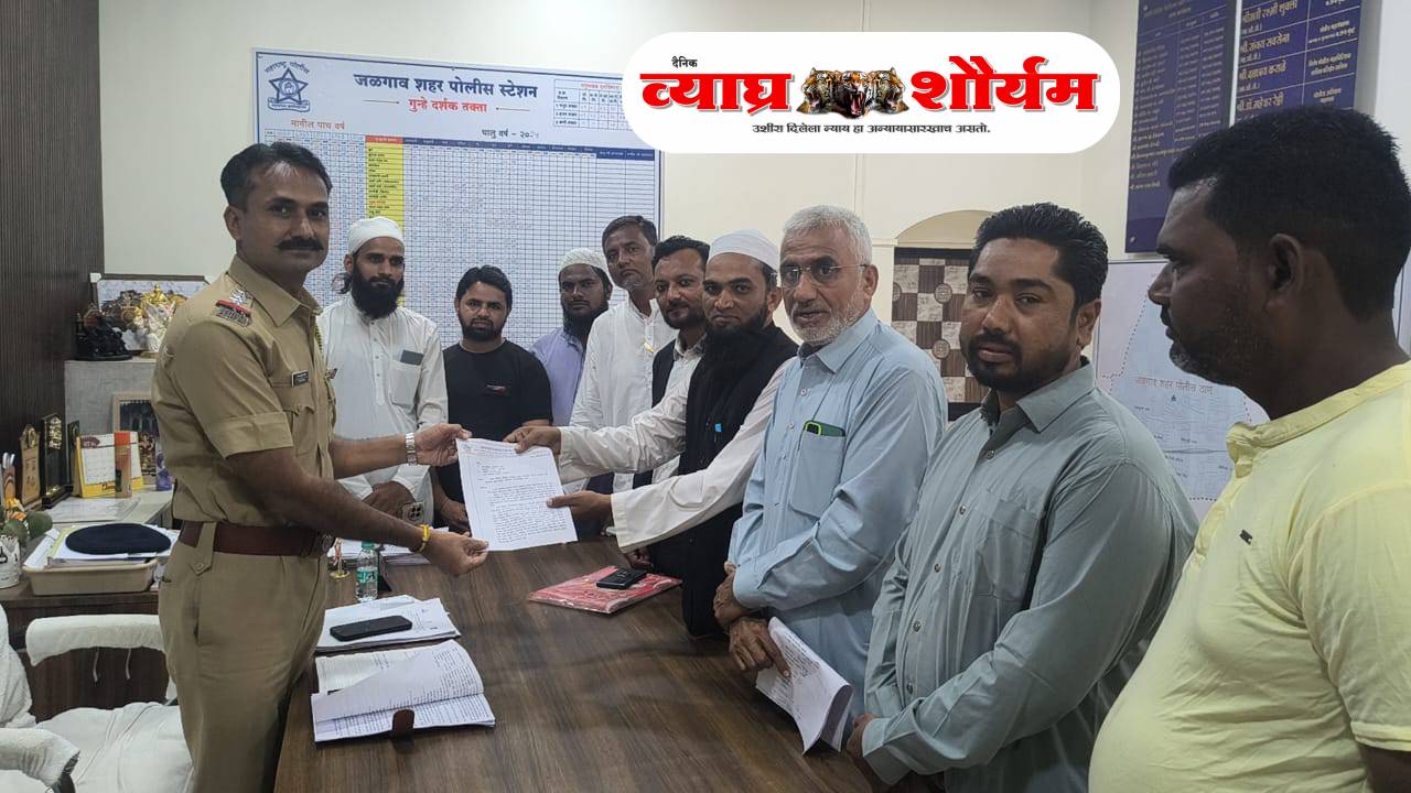 पोलीस निरीक्षक सागर शिंपी यांना तक्रारपत्र देताना मुफ़्ती खालिद, फारूक शेख, अॅड. आवेश शेख, हाफिज रहीम पटेल आदी उपस्थित.